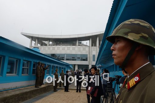 [판문점=사진공동취재단] 남북 당국간실무회담이 열린 6일 북측 통일각으로 향하는 우리측 서호 통일부 남북협력지구지원단장을 비롯한 일행들이 판문점에서 이동을 기다리고 있다.<ⓒ세계를 보는 창 경제를 보는 눈, 아시아경제(www.asiae.co.kr) 무단전재 배포금지>