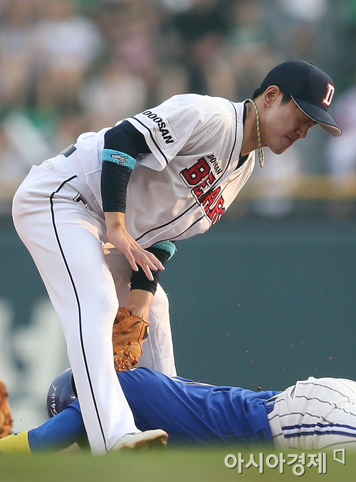 [포토] 김재호 '가랑이 사이로 들어오시면 어떡해요'