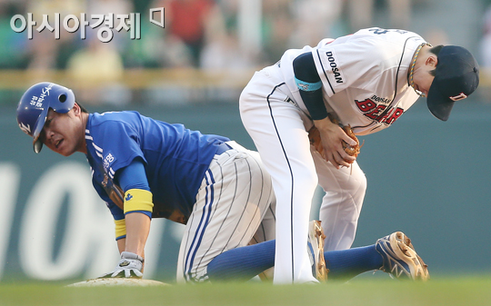 [아시아경제 정재훈 기자] 6일 오후 서울 잠실야구장에서 열린 '2013 한국야쿠르트 세븐 프로야구' 두산 베어스와 삼성 라이온즈의 경기. 3회초 무사 1루 상황 1루주자 조동찬이 2루 도루에 실패하고 있다.정재훈 기자 roze@<ⓒ세계를 보는 창 경제를 보는 눈, 아시아경제(www.asiae.co.kr) 무단전재 배포금지>