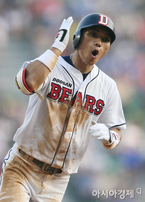 [아시아경제 정재훈 기자] 6일 오후 서울 잠실야구장에서 열린 '2013 한국야쿠르트 세븐 프로야구' 두산 베어스와 삼성 라이온즈의 경기. 3회말 선두타자 이종욱이 우익수 뒤 홈런을 치고 기뻐하고 있다.정재훈 기자 roze@<ⓒ세계를 보는 창 경제를 보는 눈, 아시아경제(www.asiae.co.kr) 무단전재 배포금지>