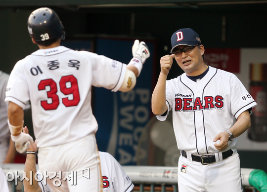 [아시아경제 정재훈 기자] 6일 오후 서울 잠실야구장에서 열린 '2013 한국야쿠르트 세븐 프로야구' 두산 베어스와 삼성 라이온즈의 경기. 3회말 선두타자 이종욱이 우익수 뒤 홈런을 치고 김진욱 감독과 기뻐하고 있다.정재훈 기자 roze@<ⓒ세계를 보는 창 경제를 보는 눈, 아시아경제(www.asiae.co.kr) 무단전재 배포금지>