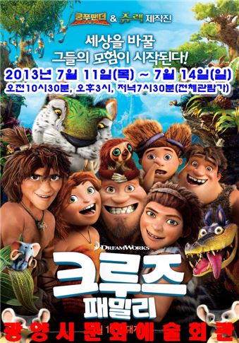 광양시가 놀라움과 눈을 떼지 못하게 하는 환상, 뭉클한 메시지, 마지막까지 감동을 주는 영화로 미국에서 선풍적인 인기를 끌었던 애니메이션 ‘크루즈 패밀리’를 문화예술회관 스크린에 올린다.오는 7월 11일부터 14일까지 나흘 동안 오전 10시 30분과 오후 3시, 저녁 7시 30분 하루 세 차례 상영되는데 아이들이 좋아하는 애니메이션이니 만큼 어린이집이나 유치원 등 단체관람을 위해 오전 시간을 추가했다.시 관계자는 관람료는 일반 시민이 1,000원으로 단체와 장애인, 자전거 이용자는 500원으로 할인해 주고 있다며, 온 시민이 누리는 문화복지 구현 차원에서 최소한의 금액을 설정했다고 밝혔다.영화 ‘크루즈 패밀리’는 선사시대를 배경으로 사춘기를 맞은 딸 ‘이프’와 중년의 가장으로서 위기감과 고뇌에 빠져 있는 아빠 ‘그러그’의 갈등을 중심으로 가족 간의 사랑과 희생, 모험을 그려낸 작품이다.이 영화는 또, 평범하지 않은 성격을 가진 가족들 못지않게 상상 속에서나 볼 수 있었던, 제각각 개성이 강하고 매력적인 캐릭터의 다양한 동물들을 등장시킴으로써 흥분과 재미를 더해 준다.특히 가족의 이야기를 놀라움과 환상으로 융합시킨 최고의 애니메이션으로 요즘 우리들의 아버지처럼 아버지가 갖고 있는 희생과 위대함을 통해 관객들에게 따뜻한 가족애와 감동을 선사한다는 평가다.시 관계자는 “오늘이 아닌 내일을 위해 세상 밖으로 나온 가족들의 재치와 예측 불가능한 반전으로 그 어떤 애니메이션보다 재미있다”며 “아마 가볍게 보러 갔다가 기대 이상의 짜릿함을 느낄 수 있을 것”이라고 말했다.노해섭 기자 nogary@<ⓒ세계를 보는 창 경제를 보는 눈, 아시아경제(www.asiae.co.kr) 무단전재 배포금지>