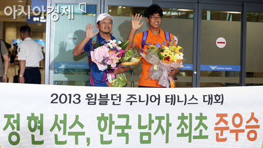 [인천=아시아경제 정재훈 기자] 윔블던 테니스대회 주니어 남자단식 준우승을 차지한 '테니스 샛별' 정현이 8일 오후 인천국제공항을 통해 귀국하며 윤용일 코치와 함께 손을 흔들고 있다.정재훈 기자 roze@<ⓒ세계를 보는 창 경제를 보는 눈, 아시아경제(www.asiae.co.kr) 무단전재 배포금지>
