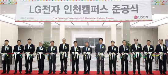 LG전자는 10일 인천 경서동에 위치한 인천캠퍼스 준공식을 가졌다. 이날 준공식에 참석한 (왼쪽 일곱번째부터) 윤상직 산업통상자원부 장관, 구본무 LG그룹 회장, 송영길 인천시장, 구본준 LG전자 부회장 등이 기념 띠를 자르고 있다. 박민규 기자 yushin@<ⓒ세계를 보는 창 경제를 보는 눈, 아시아경제(www.asiae.co.kr) 무단전재 배포금지>