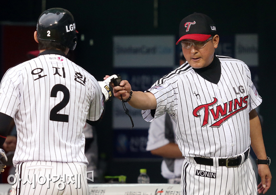 [아시아경제 정재훈 기자] 10일 오후 서울 잠실야구장에서 열린 '2013 한국야쿠르트 세븐 프로야구' LG 트윈스와 NC 다이노스의 경기. 3회말 무사 1, 3루 상황 이병규의 적시타에 3루주자 오지환이 홈인하며 김기태 감독과 손가락을 맞대고 있다.정재훈 기자 roze@<ⓒ세계를 보는 창 경제를 보는 눈, 아시아경제(www.asiae.co.kr) 무단전재 배포금지>