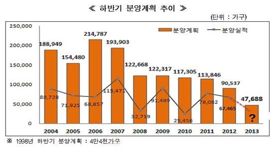 [아시아경제 한진주 기자] 올 하반기에 분양물량이 IMF 이후 최저수준인 것으로 나타났다.한국주택협회는 회원사를 대상으로 하반기 분양계획을 조사한 결과 23개사가 45개단지 총 4만7688가구를 분양할 계획이라고 11일 밝혔다. 올 상반기(7만4740가구)와 지난해 동기(9만537가구) 대비 각각 36%, 47% 감소한 것으로 IMF(4만4000가구) 이후 최저 수준이다.올 하반기에 분양되는 물량은 지역별로 ▲수도권 3만3151가구 ▲지방 1만4537가구 등이다. 사업 유형별로는 ▲재개발·재건축 2만468가구 ▲자체분양이 1만7814가구 ▲단순도급 7410가구 등이다.협회는 분양 물량 감소 요인을 소비심리 위축, 후속 대책 공백, 주택업체 불안심리 증가로 분석했다. 일부 업체는 하반기에 아예 주택사업을 포기한 것으로 알려졌다. 협회는 주택시장 정상화를 위해서는 ▲취득세율 영구 인하 ▲분양가 상한제 운용 개선 ▲다주택자 양도세 중과 폐지 ▲LTV·DTI 조정 등 4.1대책 후속 입법조치가 마련돼야 한다고 주장했다. 협회 관계자는 "건설사들이 후속사업 물량을 확보하는 데 어려움이 있고 수익성이 낮은 사업은 취소하거나 미루는 상황"이라며 "분양을 연기하거나 사업을 포기할 수 있어 계획 물량이 실제 분양으로 이어지기도 쉽지 않을 것"으로 예상했다.(자료제공 : 한국주택협회)