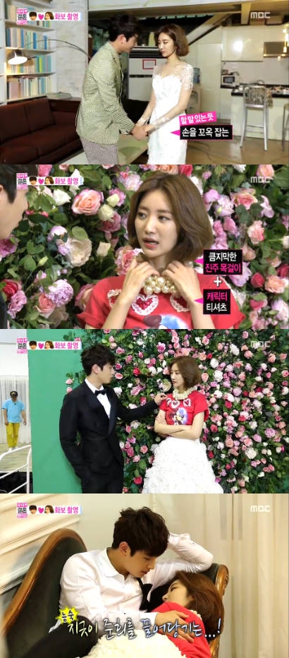 [아시아경제 장영준 기자]배우 고준희와 그룹 2AM의 정진운이 패셔니스타 부부로 탄생했다.13일 오후 방송한 MBC 예능프로그램 '우리 결혼했어요 시즌4'에서 고준희와 정진운 커플은 웨딩화보 촬영 중 세련된 의상과 포즈를 선보였다.이날 정진운은 웨딩드레스를 입고 나타난 고준희를 보고 연신 감탄하며 눈을 떼지 못했다. 이어 그는 고준희의 두 손을 꼭 잡고 "고마워, 나랑 결혼해줘서"라고 말했고, 이에 고준희는 기쁨을 감추지 못했다. 또한 고준희는 왕진주 목걸이와 캐릭터 티셔츠 등의 본인이 직접 준비한 의상으로 화보를 촬영했으며, 정진운은 탄탄한 근육질 몸매로 턱시도와 편안한 의상 모두를 완벽히 소화해냈다. 이로써 두 사람은 패셔니스타 부부의 진정한 면모를 과시했다.잠시 후, 촬영을 위해 온몸을 맞대며 쇼파에 누운 두 사람은 처음에는 부끄러움에 어색한 장면을 연출하기도 했으나, 이내 자연스러운 모습으로 보는 이들을 설레게 했다.한편 고준희, 정진운 커플은 풍선키스를 선보여 눈길을 끌었다.장영준 기자 star1@<ⓒ아시아경제 & 스투닷컴(stoo.com)이 만드는 온오프라인 연예뉴스>