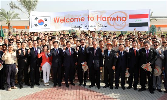 강창희 국회의장(앞줄 왼쪽 여섯번째)과 그 일행이 이라크 바그다드 인근 한화건설 비스마야 현장을 방문해 김현중 한화건설 부회장(앞줄 왼쪽 아홉번째), 아야드 마지드 이라크 국회사무총장(앞줄 좌측에서 일곱번째), 근로자들과 기념촬영하고 있다.