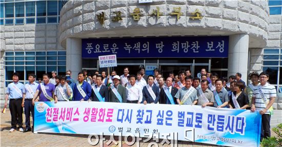 보성군 벌교읍(읍장 황선오)과 벌교읍민회(회장 강복수)에서는 지난 10일 벌교 읍내 농?수산물 판매상과 식당가를 중심으로 벌교읍 기관·사회봉사단체 등 100여 명이 참여한 가운데 벌교 경제 살리기 및 친절 서비스 캠페인을 전개했다.이번 캠페인은 언론매체 등을 통해 지역 특산품으로 널리 알려진 벌교 참꼬막을 비롯한 각종 농·수산물 등을 구입하고 맛보기 위해 많은 관광객이 지역을 방문함에 따라 식당가의 호객행위를 근절하고 친절 서비스를 개선해 보다 깨끗하고 친절한 벌교의 이미지를 심어주고 다시 찾고 싶은 벌교가 되도록 노력하자는 취지에서 추진됐다.읍사무소 직원들과 벌교읍민회원들은 시장과 식당가를 돌며 신선한 상품 판매 정량·정품 판매, 정확한 원산지 표시, 바가지요금 근절, 정성과 친절한 최상의 서비스 제공, 호객행위 근절을 외치며 전단지를 직접 배부하면서 아름다운 지역사회를 만들어 가자고 호소했다.캠페인을 주최한 강복수 벌교읍민회장은 “앞으로도 재래시장 활성화, 지역상품 애용, 거리질서 확립, 깨끗한 환경보전 등 캠페인 운동을 자주 실시해 주민들이 주인의식을 갖고 내 고장 사랑실천으로 관광객들이 다시 찾고 싶은 고장으로 만들어 가겠다”고 말했다.노해섭 기자 nogary@<ⓒ세계를 보는 창 경제를 보는 눈, 아시아경제(www.asiae.co.kr) 무단전재 배포금지>