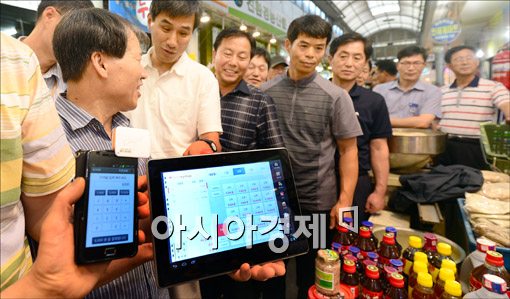 [아시아경제 최우창 기자]16일 서울 광진구 중곡 제일시장에서 중앙공무원 교육생들과 시장상인들이 IT 기술이 적용된 태블릿과 스마트폰을 이용해 창조경제 체험을 하고 있다. 최우창 기자 smicer@<ⓒ세계를 보는 창 경제를 보는 눈, 아시아경제(www.asiae.co.kr) 무단전재 배포금지>