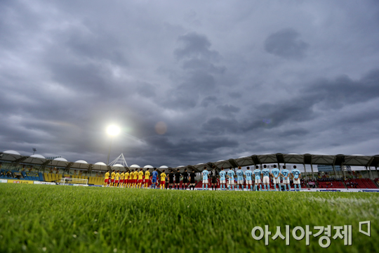 [성남=아시아경제 정재훈 기자] 16일 오후 성남 탄천종합운동장에서 열린 '현대 오일뱅크 K리그 클래식 2013' 성남 일화와 대구FC의 경기. 양 팀 선수들이 경기에 앞서 국민의례를 하고 있다.정재훈 기자 roze@<ⓒ세계를 보는 창 경제를 보는 눈, 아시아경제(www.asiae.co.kr) 무단전재 배포금지>