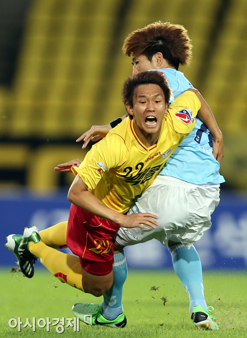 [성남=아시아경제 정재훈 기자] 16일 오후 성남 탄천종합운동장에서 열린 '현대 오일뱅크 K리그 클래식 2013' 성남 일화와 대구FC의 경기. 대구 송창호와 몸싸움을 벌이던 성남 이종원이 중심을 잃고 넘어지고 있다.정재훈 기자 roze@<ⓒ세계를 보는 창 경제를 보는 눈, 아시아경제(www.asiae.co.kr) 무단전재 배포금지>