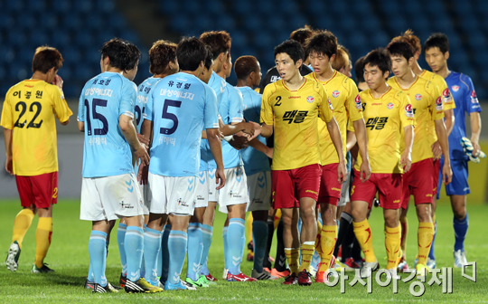 [성남=아시아경제 정재훈 기자] 16일 오후 성남 탄천종합운동장에서 열린 '현대 오일뱅크 K리그 클래식 2013' 성남 일화와 대구FC의 경기. 대구의 1:0 승리. 양 팀 선수들이 악수를 나누고 있다.정재훈 기자 roze@<ⓒ세계를 보는 창 경제를 보는 눈, 아시아경제(www.asiae.co.kr) 무단전재 배포금지>