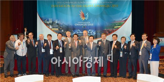 강운태 광주광역시장은 16일 오전(현지시간) 러시아 카잔 코르스톤호텔에서 FISU 및 회원국 대표, 집행위원, 한국대표단 등 300여명이 참석한 가운데 열린 2015광주유니버시아드대회 조직위원장 초청 리셉션에 참석, 광주U대회 성공을 기원하는 파이팅을 외치고 있다. 사진제공=광주시 노해섭 기자 nogary@ <ⓒ세계를 보는 창 경제를 보는 눈, 아시아경제(www.asiae.co.kr) 무단전재 배포금지>