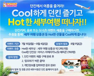 [아시아경제 오주연 기자]던킨도너츠는 해외여행권 및 아이스 아메리카노 등 푸짐한 경품을 증정하는 ‘카카오톡 썸머 프로모션’을 진행한다고 17일 밝혔다.다음달 4일까지 카카오톡 선물하기 페이지에서 ‘썸머 프로모션’ 이벤트 제품 28종 중 하나를 구매하고 이벤트에 응모하면 추첨을 통해 세부 여행상품권 1인 2매(1명)와 아이스 아메리카노(S) 해피콘(700명)을 증정한다. 이벤트 대상 품목은 올 여름 무더위를 날려버릴 아이스 아메리카노, 던카치노 등 여름음료 21종과 도너츠, 베이글 등 세트 7종으로 다양하다. 이 중 아이스 아메리카노는 뛰어난 바디감과 신선도로 꾸준한 사랑을 받고 있는 던킨도너츠의 대표 여름음료다. 던킨도너츠 커피는 글로벌 프랜차이즈 최초로 국내에 세워진 로스팅 센터에서 직접 로스팅한 원두를 사용할 뿐 아니라 큐그레이더(커피감정사)가 산지 생두 구입에서 국내 로스팅까지의 전 과정에 참여해 풍부한 바디감과 신선함을 느낄 수 있다.또한 리얼 에스프레소 샷을 직접 넣고 만들어 풍부한 커피의 맛과 향을 경험할 수 있는 색다른 아이스커피 음료 ‘던카치노’도 많은 인기를 얻고 있다. ‘카라멜’, ‘카푸치노’, ‘모카’, ‘그린티’, ‘레드빈 그린티’, ‘초코치노’ 등 총 6종을 만나볼 수 있으며 올해 새롭게 출시한 ‘레드빈 그린티 던카치노’와 ‘초코치노’는 평소 커피를 즐기지 않는 사람들에게 제격이다.던킨도너츠 관계자는 “본격적인 휴가철을 맞이해 평소 던킨도너츠를 사랑해주시는 고객들을 위해 이번 이벤트를 준비했다”며 “올 여름은 던킨도너츠와 함께 풍성하고 시원한 여름이 되길 바란다”고 말했다. 오주연 기자 moon170@<ⓒ세계를 보는 창 경제를 보는 눈, 아시아경제(www.asiae.co.kr) 무단전재 배포금지>
