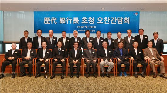 18일 서울 회현동 우리은행 본점에서 열린 역대 은행장 초청 오찬간담회에서 참석자들이 기념촬영을 하고 있다. 사진 뒷줄 왼쪽부터 김용우 상임감사위원, 황석희, 이덕훈, 이관우, 정지태, 배찬병, 신동혁, 김진만, 김경우, 황영기, 박해춘 전 행장, 김양진 수석부행장. 아랫줄은 왼쪽부터 설홍렬, 박명규, 이석주, 정재철 전 행장, 이순우 회장, 김상찬, 박종석, 이현기, 이병선, 박종대 전 행장.