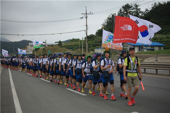 [아시아경제 임혜선 기자]아웃도어 브랜드 노스페이스가 개최한 제10회 대학생 국토순례단 '2013 노스페이스 대한민국 희망원정대'가 19일 서울시청광장에서 완주식을 갖고 19박 20일로 진행된 470Km 도보 대장정을 마무리한다.지난 1일 발대식을 갖고 대장정에 돌입했던 '2013 노스페이스 대한민국 희망원정대'는 19일 종착지인 서울시청광장에 도착한다. 이번 원정대에는 '도전하는 젊음과 열정! 그리고 나눔!'을 주제로 총 65개 대학교, 96명(남녀 각 48명)의 학생들이 참가했으며, 하루 평균 25Km, 최대 9시간을 걷는 강행군 끝에 최종 93명(남 48명, 여 45명)의 대원이 470Km 완주에 성공했다.이날 완주식에는 영원아웃도어 허호기 감사를 비롯해 서울시 관광정책관 서정협 국장, 대한산악연맹 이인정 회장 등이 참여, 대원들의 무사 귀환을 축하하고 대장정 완주증을 전달한다. 또 완주자들이 국토순례 중 1Km 마다 자발적으로 적립했던 기부금에 노스페이스가 매칭 그랜트로 기부금을 더해 총 558만원이 사회복지법인 한국심장재단에 생명나눔기금으로 전달될 예정이다.임혜선 기자 lhsro@<ⓒ세계를 보는 창 경제를 보는 눈, 아시아경제(www.asiae.co.kr) 무단전재 배포금지>