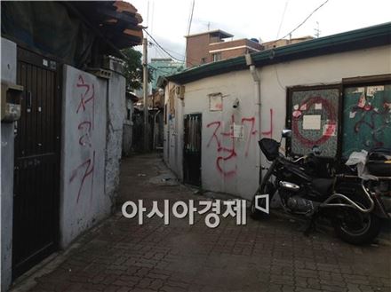 [아시아경제 한진주 기자] "1-4구역은 사업성이 좋다. 비례율이 120%인데 이런 곳이 흔치 않다. 현재 1000만~2000만원대의 웃돈이 붙어 거래되고 있다." (영등포 A중개업소 사장)영등포 뉴타운 내에서는 1-4구역이 투자가치가 제일 높은 구역으로 꼽힌다. 지하철 5호선 영등포시장역과 인접한 역세권인데다 여의도와도 가깝기 때문이다. 면적도 영등포 뉴타운 26개 구역중 가장 넓다. 영등포시장역 2번 출구로 나와 골목으로 들어가면 바로 1-4구역이 나온다. 30년 이상 된 낡은 단독주택과 빌라가 밀집된 지역이다. 이주가 완료된 집에는 붉은색 락카로 '철거' 표시가 돼있고 잡초가 무성하게 자라나있다. '공· 폐가 경찰관 집중 순찰지역'이라는 경고문도 눈에 띄었다.영등포 뉴타운 1-4구역은 낡은 주택·다세대 빌라가 밀집해있다. 아직 이주하지 않은 집 창가에는 빨래가 널려있다.