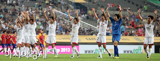 [아시아경제 정재훈 기자] 21일 오후 서울월드컵경기장에서 열린 '2013 EAFF 동아시안컵' 여자부 대한민국과 북한의 경기. 2:1 승리를 거둔 북한 선수들이 인사하고 있다.정재훈 기자 roze@<ⓒ세계를 보는 창 경제를 보는 눈, 아시아경제(www.asiae.co.kr) 무단전재 배포금지>