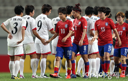 [아시아경제 정재훈 기자] 21일 오후 서울월드컵경기장에서 열린 '2013 EAFF 동아시안컵' 여자부 대한민국과 북한의 경기. 2:1로 패배한 한국 선수들이 북한 선수들과 악수를 나누고 있다.정재훈 기자 roze@<ⓒ세계를 보는 창 경제를 보는 눈, 아시아경제(www.asiae.co.kr) 무단전재 배포금지>