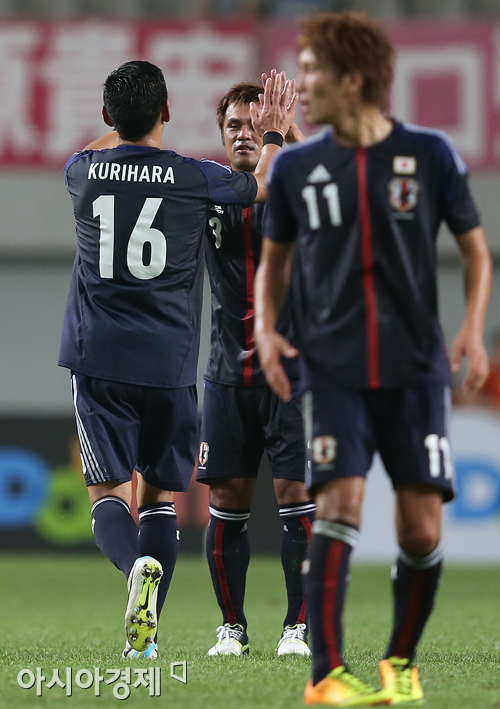 [아시아경제 정재훈 기자] 21일 오후 서울월드컵경기장에서 열린 '2013 EAFF 동아시안컵' 남자부 일본과 중국의 경기. 일본 구리하라 유조가 동점골을 넣고 동료와 기쁨을 나누고 있다.정재훈 기자 roze@<ⓒ세계를 보는 창 경제를 보는 눈, 아시아경제(www.asiae.co.kr) 무단전재 배포금지>