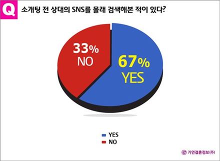 [아시아경제 온라인이슈팀] 미혼 남녀 절반 이상이 소개팅 전 상대방이 운영하는 블로그나 소셜네트워크서비스(SNS)를 검색해 보는 것으로 나타났다.결혼정보회사 가연이 미혼남녀 338명(남 166명, 여 172명)에게 '소개팅 전 상대방 SNS를 찾아본 적 있는가'를 질문한 결과 응답자 67%가 '그렇다'고 답했다. 이 중 '상대방 SNS를 본 것이 소개팅 결과에 영향을 미쳤는가'란 추가 질문에는 61%가 긍정의 뜻을 표했다.소개팅에 부정적인 영향을 주는 SNS 글로는 '비방이나 허세가 담긴 포스팅'이 40%의 응답률로 1위를 차지했다. 2위는 '수많은 이성친구들의 댓글들'(32%)이었다. 3위는 ‘지난 사랑의 흔적’(17%), 4위는 ‘4차원적인 발상을 담은 게시물’(6%) 등이 뒤를 이었다. 기타 '특이한 취미나 기호' 등에 부담감을 느꼈다는 응답이 있었다.