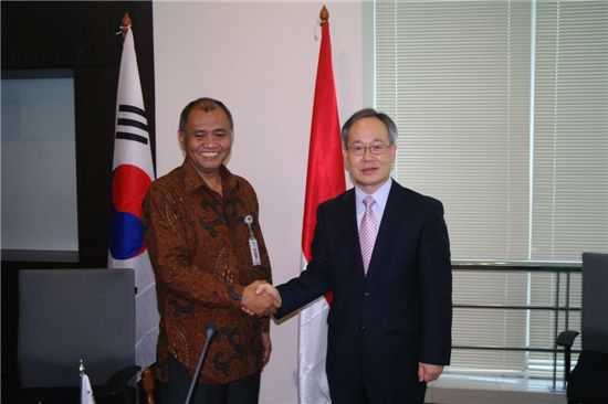 [아시아경제 왕성상 기자] 민형종(오른쪽) 조달청장은 22일(현지시간) 인도네시아 자카르타에서 아구스 라하르조 조달청장과 정부조달 협력회의를 갖고 ‘한-인니 정부조달 협력 양해각서(MOU)’를 체결했다. 이를 계기로 동남아시아 국가 중 우리나라의 최대 교역국인 인도네시아 조달시장에 우리 기업이 효과적으로 나갈 수 있는 바탕을 마련했다.왕성상 기자 wss4044@<ⓒ세계를 보는 창 경제를 보는 눈, 아시아경제(www.asiae.co.kr) 무단전재 배포금지>