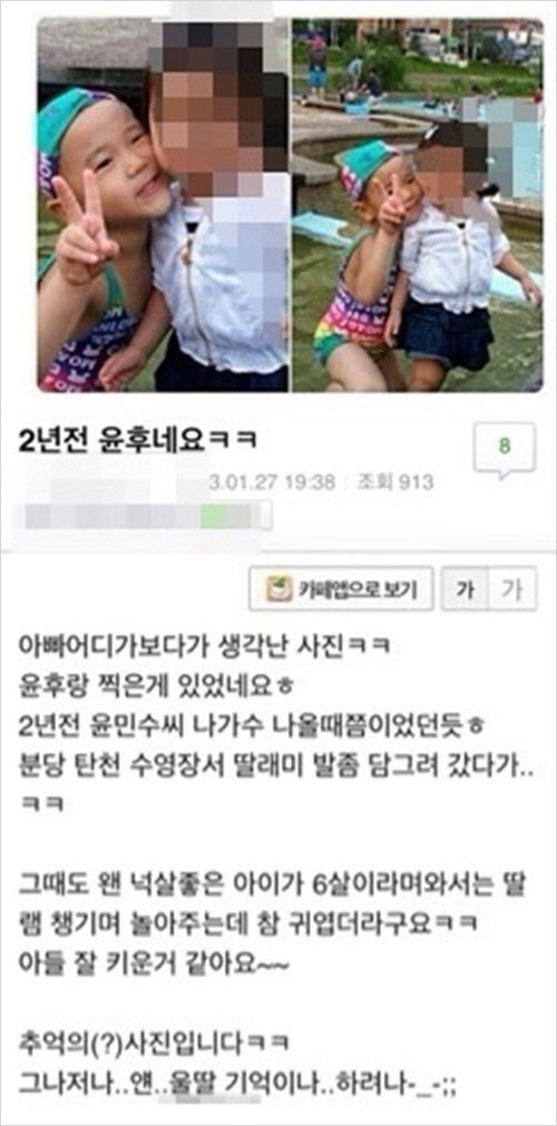[아시아경제 장영준 기자] 가수 윤민수의 아들 윤후 군의 2년 전 사진이 공개됐다.최근 한 온라인 커뮤니티 게시판에는 '윤후 2년 전'이라는 제목의 사진이 게재돼 눈길을 끌었다.사진 속 윤후는 화려한 무늬와 색깔의 수영복을 입고 한 여자아이와 다정한 포즈를 취한 채 카메라를 응시하고 있다. 사진을 게시자는 "'아빠 어디가'를 보다가 생각났다"며 2년 전 수영장에서 윤후와 만난 일화를 소개했다.그는 "웬 넉살 좋은 아이가 여섯 살이라며 와서는 딸을 챙기면서 놀아주는데 참 귀여웠다. 아들 잘 키운 것 같다"며 당시를 떠올렸다.윤후 2년 전 사진을 접한 누리꾼들은 "윤후 2년 전에도 변함없이 귀여운 외모네요" "윤후 2년 전에도 동생을 챙기는 자상함" "윤후 2년 전이나 지금이나 사랑스러워요" 등의 반응을 보였다.장영준 기자 star1@<ⓒ아시아경제 & 스투닷컴(stoo.com)이 만드는 온오프라인 연예뉴스>