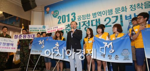 [아시아경제 최우창 기자]26일 서울 중구 프레스센터에서 열린 병무청 '2013 스무살 청춘원정대 2기 발대식' 행사에 참석한 박창명 병무청장이 인사말을 전하고 있다.최우창 기자 smicer@<ⓒ세계를 보는 창 경제를 보는 눈, 아시아경제(www.asiae.co.kr) 무단전재 배포금지>