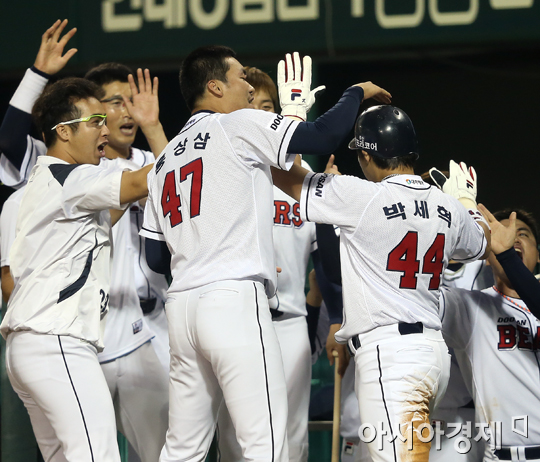 [아시아경제 정재훈 기자] 26일 오후 서울 잠실야구장에서 열린 '2013 한국야쿠르트 세븐 프로야구' LG 트윈스와 두산 베어스의 경기. 3회말 2사 2루 상황 1타점 적시타에 2루주자 박세혁이 홈인하며 동료들과 기쁨을 나누고 있다.정재훈 기자 roze@<ⓒ세계를 보는 창 경제를 보는 눈, 아시아경제(www.asiae.co.kr) 무단전재 배포금지>