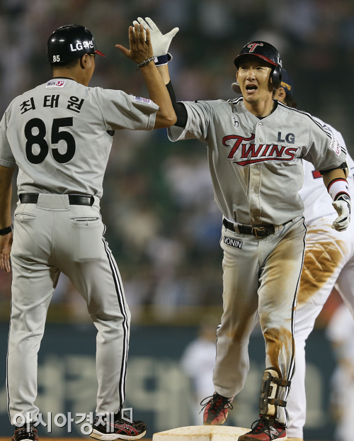 [아시아경제 정재훈 기자] 26일 오후 서울 잠실야구장에서 열린 '2013 한국야쿠르트 세븐 프로야구' LG 트윈스와 두산 베어스의 경기. 4회초 2사 1, 2루 상황 손주인이 2타점 적시 3루타를 치고 기뻐하고 있다.정재훈 기자 roze@<ⓒ세계를 보는 창 경제를 보는 눈, 아시아경제(www.asiae.co.kr) 무단전재 배포금지>