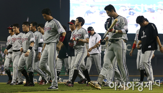 [아시아경제 정재훈 기자] 26일 오후 서울 잠실야구장에서 열린 '2013 한국야쿠르트 세븐 프로야구' LG 트윈스와 두산 베어스의 경기. 12:15 패배에 아쉬워하며 퇴장하는 LG 선수들.정재훈 기자 roze@<ⓒ세계를 보는 창 경제를 보는 눈, 아시아경제(www.asiae.co.kr) 무단전재 배포금지>