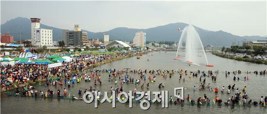 연일 무더위가 기승을 부린가운데 30일 오후 제6회 정남진 장흥 물 축제장인 탐진강 장흥대교와 분수대 사이에 강을 가로질러 조성한 물고기잡기 체험장에 하루 1000명 이상이 찾는 등 관광객들에게 큰 인기를 끌고 있다.노해섭 기자 nogary@<ⓒ세계를 보는 창 경제를 보는 눈, 아시아경제(www.asiae.co.kr) 무단전재 배포금지>
