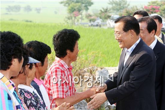 박준영 전남도지사가 30일 오후 보성군 웅치면 용반리 보성대은행복마을을 방문해 주민들을 격려하고 있다.