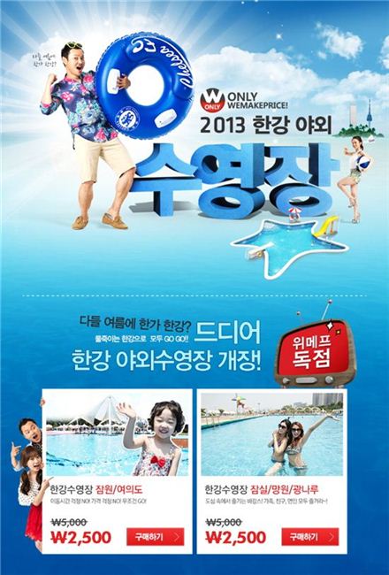 [아시아경제 이정민 기자]소셜커머스 위메프(대표 박은상·허민)는 잠원, 여의도, 잠실, 망원, 광나루 등 5개 한강수영장 이용권을 50% 할인 판매한다고 31일 밝혔다.한강수영장은 한강을 보며 수영을 즐길 수 있고 도심과 가까운 곳에 위치해 대중교통으로도 이용할 수 있는 것이 가장 큰 특징이다. 샤워시설, 매점, 에어바운스 등의 부대시설을 갖추고 있어 이용객들의 편의를 돕고 있는 것도 장점 중 하나.여의도 수영장은 시원한 물줄기가 쏟아지는 4m 높이의 아쿠아링, 물대포와 물이 흐르는 소용돌이 스파이럴 터널로 대형 워터파크 못지 않은 시설을 자랑한다. 잠원 수영장은 풀 뿐 아니라 바나나보트에서 웨이크보드까지 다양한 종류의 레포츠를 즐길 수 있다.위메프에선 이러한 수영장을 2500원에 이용할 수 있는 할인권을 제공한다. 한편 입장권 외에도 5개 수영장 근처의 맛집들을 엄선, 최대 50% 할인된 가격으로 일식, 중식, 태국음식부터 배달음식까지 다양한 종류의 음식들을 맛볼 수 있는 기획전도 함께 준비했다.조맹섭 위메프 투어앤컬쳐 그룹장은 “서울 시민이라면 누구라도 가격이나 교통체증 부담 없이 즐길 수 있도록 준비했다”며 “한강 수영장 인근 맛집까지 모두 할인된 가격으로 선보여 고객들의 식비 부담도 줄일 수 있도록 했다”고 설명했다. 이정민 기자 ljm1011@<ⓒ세계를 보는 창 경제를 보는 눈, 아시아경제(www.asiae.co.kr) 무단전재 배포금지>