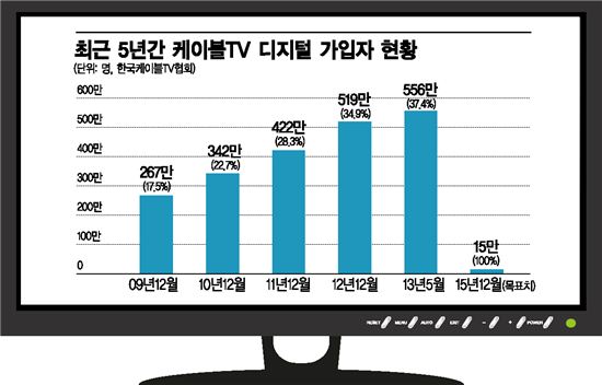 케이블TV, 아날로그와 동거 딜레마 채널 가지고 있을수록 손해..아날로그 채널 1개 주파수로 HD채널 4~6개 가능 2015년까지 디지털 100% 목표인데 현재 37%뿐