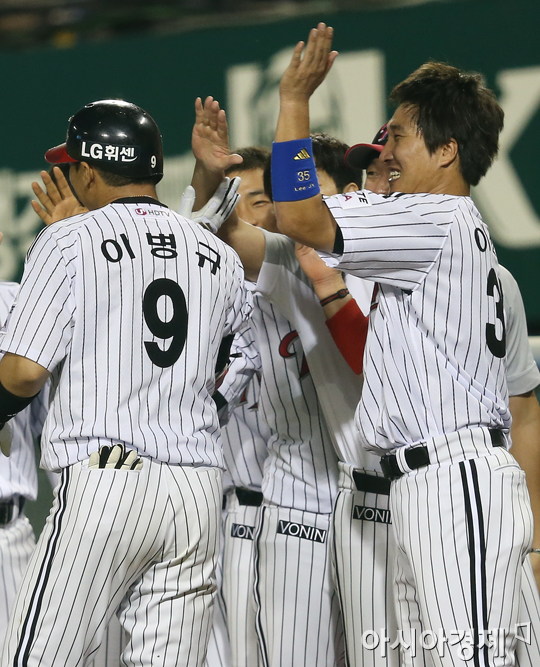 [아시아경제 정재훈 기자] 2일 오후 서울 잠실야구장에서 열린 '2013 한국야쿠르트 세븐 프로야구' LG 트윈스와 삼성 라이온즈의 경기. 6회말 2사 1루 상황 이병규가 우익수 뒤 투런홈런을 치고 동료들과 기쁨을 나누고 있다.정재훈 기자 roze@<ⓒ세계를 보는 창 경제를 보는 눈, 아시아경제(www.asiae.co.kr) 무단전재 배포금지>