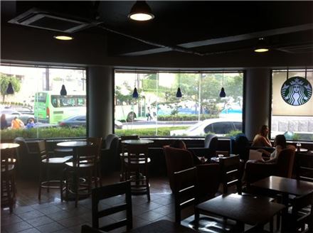 스타벅스는 전력 수요가 집중되는 여름철을 맞아 지난달 22일부터 전력 피크 시간대인 오후 2시부터 5시까지를 ‘그린 아워’로 정해 매장 창가 주변의 일부 조명을 소등하고 있다. 사진은 예술의 전당점.