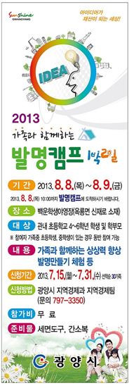 광양시(시장 이성웅)가 여름방학을 맞아 오는 8일부터 9일까지 옥룡면 백운학생야영장에서 관내 초등학생과 학부모가 함께 하는 ‘1박2일! 발명캠프’ 를 개최한다.‘1박2일! 발명캠프’는 발명에 대한 관심을 가지고 아이디어를 통한 발명품을 직접 만들어 봄으로써 창의력과 성취욕을 향상시켜 미래 과학인재를 육성하기 위해서 실시된다.이번 발명캠프에서는 발명과 지식재산권에 대한 기초지식을 교육함으로써 발명의 기법, 여러 가지 발명품이 발명되기까지의 과정, 지식재산권 등록 이유와 신청 방법 등을 자세하게 배울 수 있는 기회가 될 것으로 기대된다.또한, 과학마술 및 게임을 통해 마술속에 담긴 과학적인 요소를 배우고, ‘재미있는 롤러코스트’, ‘진동로봇 경주하기’, ‘그림악기 연주하기’, ‘로봇과 K-nex의 만남’, ‘3D 입체사진’, ‘행복한 우리집 만들기’ 등 참가가족이 함께 발명품을 조립, 조종하면서 느낀 점을 발표하는 등 다채로운 프로그램으로 운영된다.시 관계자는 “이번 행사로 부모와 함께 체험활동을 함으로써 발명에 대한 이해는 물론 가족화합에 크게 기여할 것으로 기대된다”고 밝혔다.한편, ‘1박2일! 발명캠프’는 광양시가 전남 최초로 지식재산도시 선정 3차 년도를 맞아 추진하는 사업으로 매년 여름방학기간동안 개최해 오고 있으며, 올해 3회째를 맞이하는 행사이다.노해섭 기자 nogary@ <ⓒ세계를 보는 창 경제를 보는 눈, 아시아경제(www.asiae.co.kr) 무단전재 배포금지>