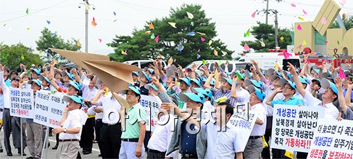 개성공단 기업인들이 7일 오전 임진각에 모여 정상화를 기원하는 종이비행기를 날리고 있다.