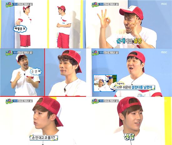 [아시아경제 유수경 기자]인피니트 성규가 '과거 전교 2등'의 자존심을 지켰다.10일 오후 방송된 MBC '무한도전'에서는 2PM 준케이, 천명훈, 임원희, UV의 뮤지, 존박, 김민교, 인피니트 성규가 출연한 '예능 여름 캠프' 특집이 전파를 탔다.빨간팀의 첫 번째 주자 임원희는 손을 사용하지 않고 코 푸는 흉내를 냈다. 그는 실제로 침과 콧물을 흘리며 열성적으로 퀴즈에 임했다.이때 경쟁자인 파란팀 길은 "저 형은 진짜 푼다"라고 말해 이들에게 결정적인 힌트를 주고 말았다.이후 존박 노홍철 뮤지 정형돈이 차례로 이를 이어받았고 마지막 주자 성규는 다소 아리송한 표정을 지어보였다. 이에 모두가 불안에 떨었지만 그는 정답인 '손 안 대고 코풀기'를 정확하게 맞춰 환호를 이끌어냈다.한편 이날 성규는 과거 중학교 재학 시절 전교 2등을 한 적이 있다고 밝혀 눈길을 끌었다. 유수경 기자 uu84@asiae.co.kr<ⓒ아시아경제 & 스투닷컴(stoo.com)이 만드는 온오프라인 연예뉴스>