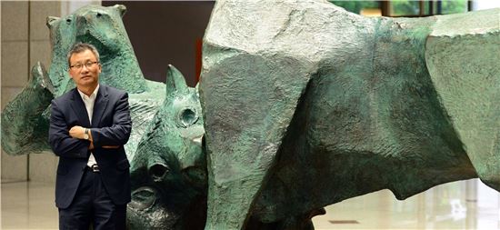 ▲김창호 코넥스협의회장(아진엑스텍 대표)가 한국거래소 신관 '소와 곰' 동상 앞에서 포즈를 취하고 있다.