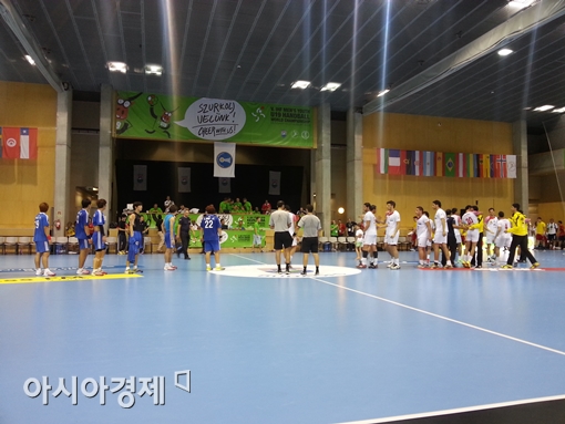 한국 선수단(왼쪽)이 14일(한국시간) 헝가리 부다요시 스포츠홀에서 가진 튀니지와의 제5회 IHF 세계청소년선수권 예선 B조 3차전에서 패한 뒤 아쉬워 하고 있다. [사진=대한핸드볼협회 제공]