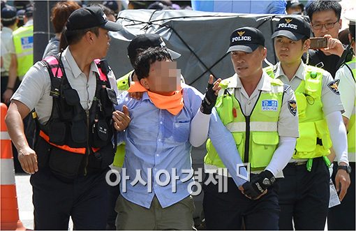 [아시아경제 윤동주 기자] 15일 광복 68주년 기념 8·15평화통일대회에 참가한 한 참가자가 서울역에서 을지로입구역까지 행진하다 경찰에게 연행되고 있다.윤동주 기자 doso7@asiae.co.kr<ⓒ세계를 보는 창 경제를 보는 눈, 아시아경제(www.asiae.co.kr) 무단전재 배포금지>