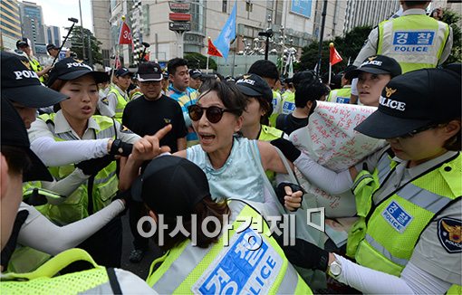 [아시아경제 윤동주 기자] 15일 광복 68주년 기념 8·15평화통일대회에 참가한 한 참가자가 서울역에서 을지로입구역까지 행진하다 경찰에게 연행되고 있다.윤동주 기자 doso7@asiae.co.kr<ⓒ세계를 보는 창 경제를 보는 눈, 아시아경제(www.asiae.co.kr) 무단전재 배포금지>