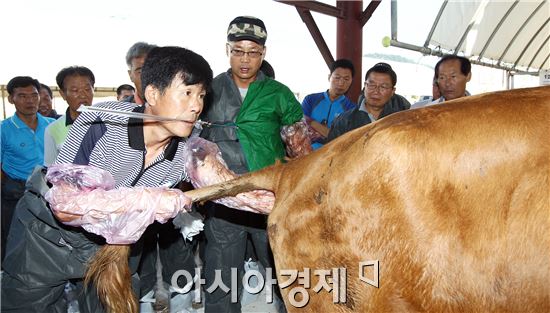 함평군농업대학(대학장 군수 안병호) 한우반 교육생들이 20일 오전 함평 우시장에서 한우 자가 인공수정 실습교육을 받고 있다. 사진제공=함평군노해섭 기자 nogary@<ⓒ세계를 보는 창 경제를 보는 눈, 아시아경제(www.asiae.co.kr) 무단전재 배포금지>