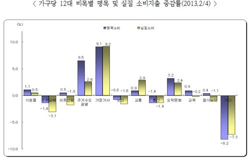 [아시아경제 김혜민 기자] 불황이 장기화되면서 서민들의 지갑이 좀처럼 열리지 않고 있다. 소비지출에서 물가상승분을 제외한 실질소비는 지난해 3·4분기 이후 4개월 연속 감소세다. 정기적, 필수적으로 지출해야만 하는 곳을 제외하고는 소비를 줄이려는 모습이 두드러지는 양상이다. 통계청이 23일 발표한 '2013년 2분기 가계동향'을 보면 올 2분기 2인 이상 가구당 월평균 소비지출은 240만3000원으로 전년 동기 대비 0.7% 늘었다. 예년보다 일찍 찾아온 더위로 인해 에어컨과 제습기 등 가전소비가 전년보다 9.1% 늘어난 영향이다. 그러나 물가상승률이 반영된 실질소비지출은 전년 동기 대비 0.4% 줄어 4분기 연속 하락세를 보였다.