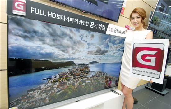 ▲LG전자가 'G프로젝트' 인증 대상을 기존 생활가전에서 벗어나 모든 제품으로 확대했다. 이에 따라 G프로젝트에 새로 선정된 55인치 UHD TV를 LG전자 모델이 소개하고 있다.