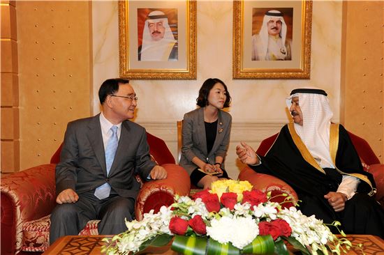 ▲정홍원 총리가 바레인 칼리파 총리와 회담을 갖고 있다.[사진제공=국무총리실]