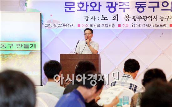 노희용 광주시 동구청장은 최근 히딩크호텔 6층 연회장에서 21세기남도포럼이 주관하는 정례포럼에 참석, '문화와 광주 동구의 미래' 란 주제로 강연을 실시했다. 노 청장은 이날 강연에서 ‘국립아시아문화전당 개관에 발맞춰 아시아문화자치구가 되기 위한 준비를 지역민과 함께 머리를 맞대고 본격적으로 추진해야할 중요한 시기가 바로 지금’이라고 전제하고 ‘이 같은 내실있는 준비야말로 문화를 매개로 생활환경적으로, 정신적으로 한 단계 더 높은 삶의 질이 보장된 지속가능한 행복공동체의 밑거름이 될 수 있다’고 역설했다. 노해섭 기자 nogary@<ⓒ세계를 보는 창 경제를 보는 눈, 아시아경제(www.asiae.co.kr) 무단전재 배포금지>